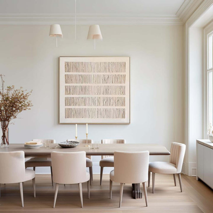 Introduce a soothing sense of rhythm and texture to your space with this linear rhythm wall art. The artwork features a series of vertical lines meticulously arranged in a repeating pattern, evoking the natural flow and movement found in nature. The soft, earthy tones and subtle variations in color lend the piece a tranquil and harmonious quality, making it an ideal addition to both modern and minimalist interiors. The tactile surface invites closer inspection, revealing the intricate craftsmanship that brings depth and dimension to the design. Perfect for enhancing the serene atmosphere of a living room, bedroom, or study, this artwork complements a variety of decor styles while providing a timeless aesthetic that resonates with simplicity and elegance.