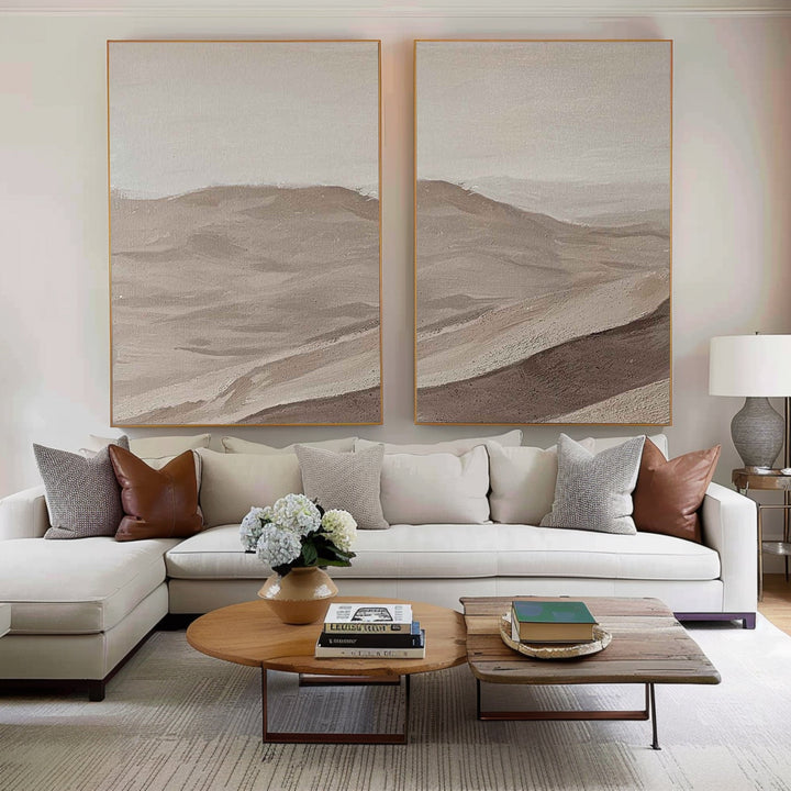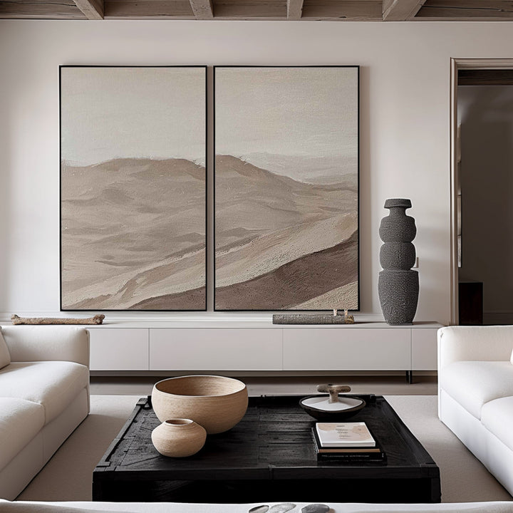 Transform your space with the calming "Neutral Tones Landscape Diptych," a beautifully serene pair of artworks that depict rolling landscapes in soft, earthy hues. The minimalist design and muted color palette of beige, taupe, and soft brown blend seamlessly into any interior, providing a subtle yet impactful addition to your home decor. Each canvas captures the gentle curves of distant hills, evoking a sense of peace and tranquility, perfect for spaces that need a touch of natural elegance. The understated beauty of this diptych makes it versatile enough to complement both modern and traditional interiors, while its calming tones make it ideal for bedrooms, living rooms, or office spaces. Whether you are looking to create a peaceful sanctuary or a sophisticated backdrop, these landscape paintings add depth and a sense of calm to any room.