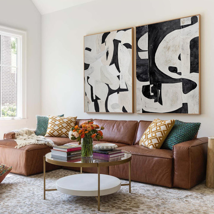 "Monochrome Abstractions" is a stunning diptych that brings modern elegance to any space. This pair of abstract oil paintings in black and white features bold, expressive strokes and dynamic shapes that create a sense of movement and intrigue. The contrasting tones and intricate textures offer a striking visual impact, perfect for a contemporary setting.