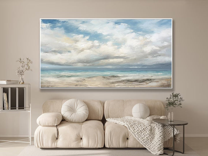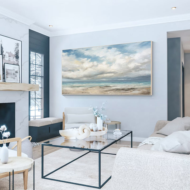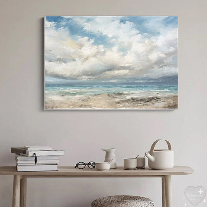 "Calm Coastal Bliss" captures the serene beauty of a peaceful beach scene with an expansive sky. This decorative oil painting features a harmonious blend of soft blues, gentle whites, and sandy beiges, perfectly encapsulating the tranquility of a calm day by the sea. The detailed depiction of the sky and waves, combined with the subtle reflections on the water, adds depth and dimension to the artwork, creating a soothing visual retreat for any room.